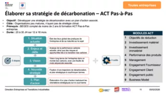 L’accompagnement ACT Pas‑à‑pas guide l’entreprise dans la construction concrète de sa stratégie de décarbonation et de son plan de transition associé.